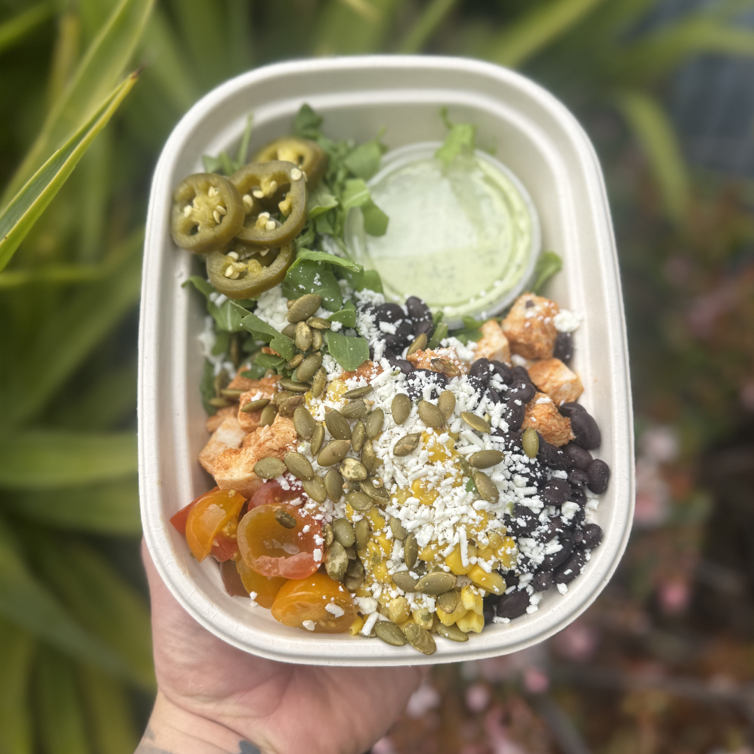 Organic Chipotle Chicken Breast*, Corn, Black Beans, Quinoa, Cherry Tomatoes, Arugula, Cotija Cheese, Pickled Jalapeño, Pumpkin Seeds with a Creamy Avocado Lime Cilantro Dressing.