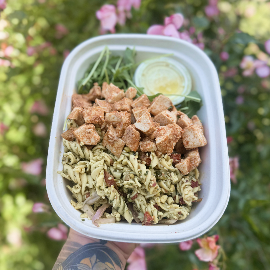 Chickpea Pasta, Organic Mediterranean Spiced Chicken Breast*, Black Olives, Sundried Tomatoes, Pickled Red Onions, Baby Greens, Parmesan Cheese, with a Lemon & Olive Oil Yogurt Dressing.