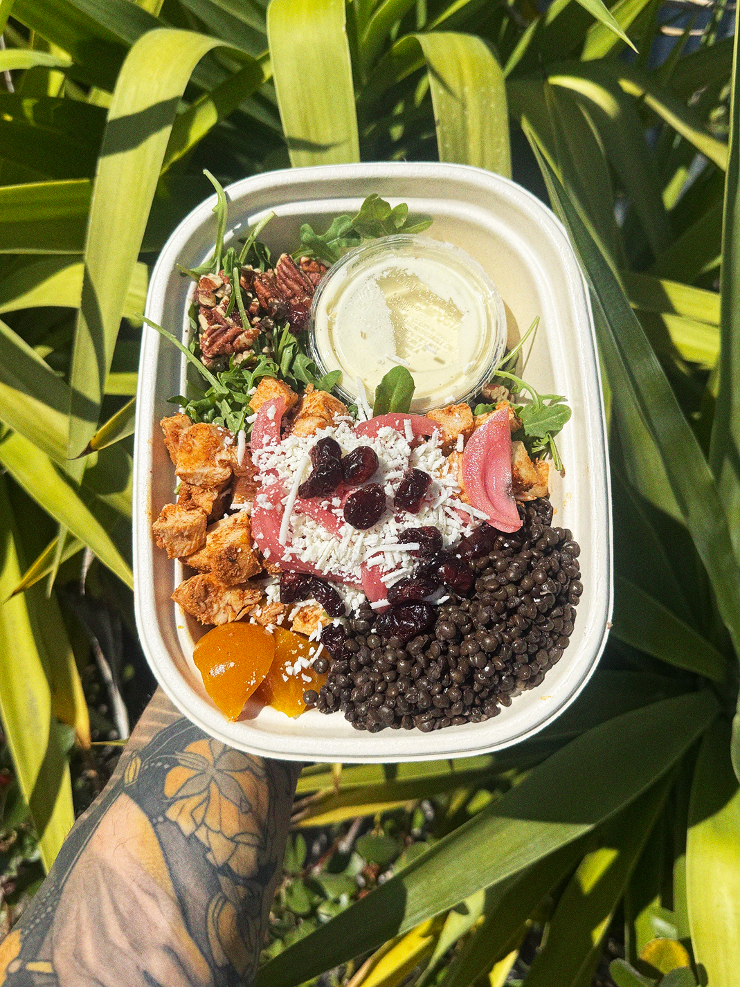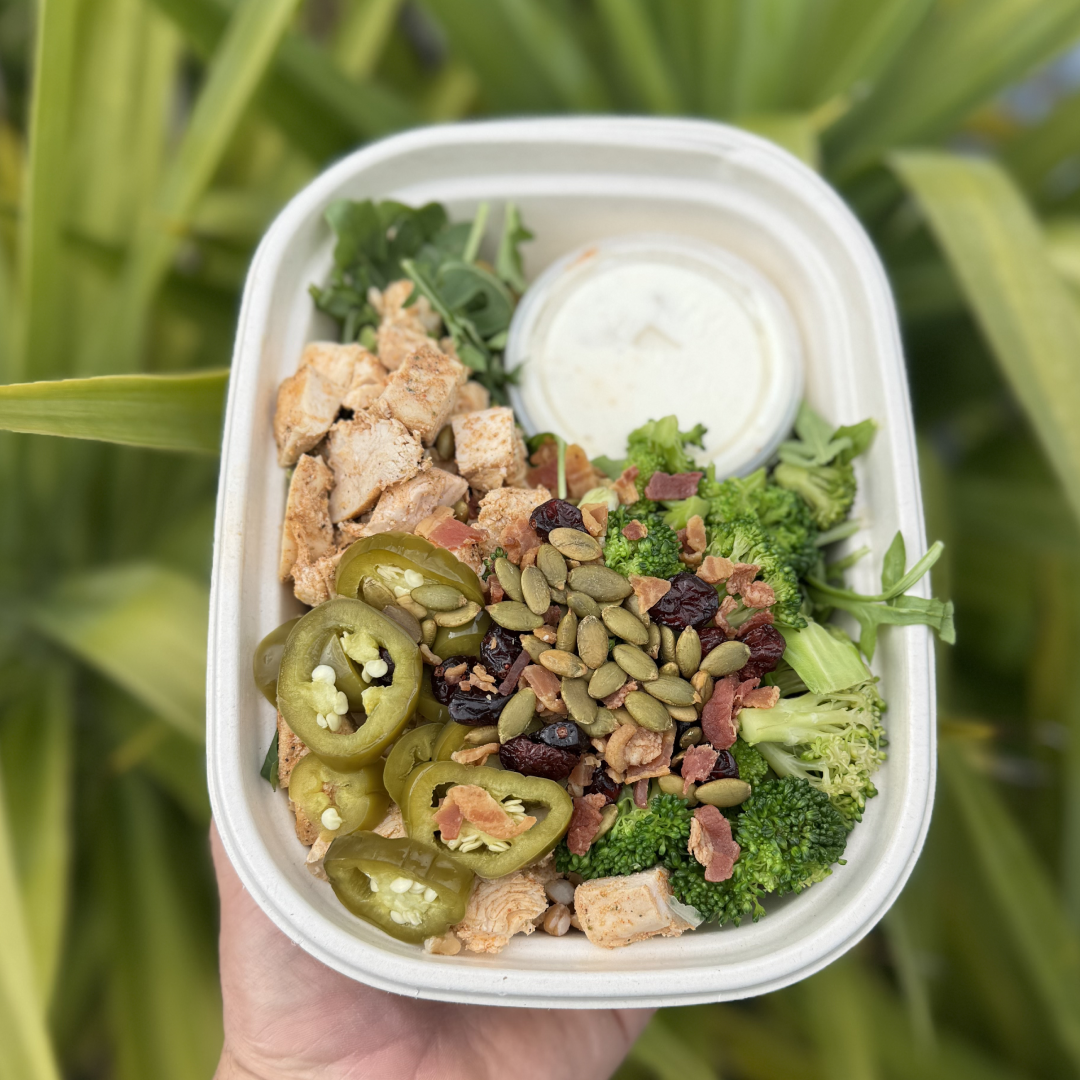Farro, Organic Chicken Breast, Broccoli, Baby Greens, Pickled jalapeños, Pumpkin Seeds, Bacon, Dried Cranberries, Buffalo Ranch Dressing